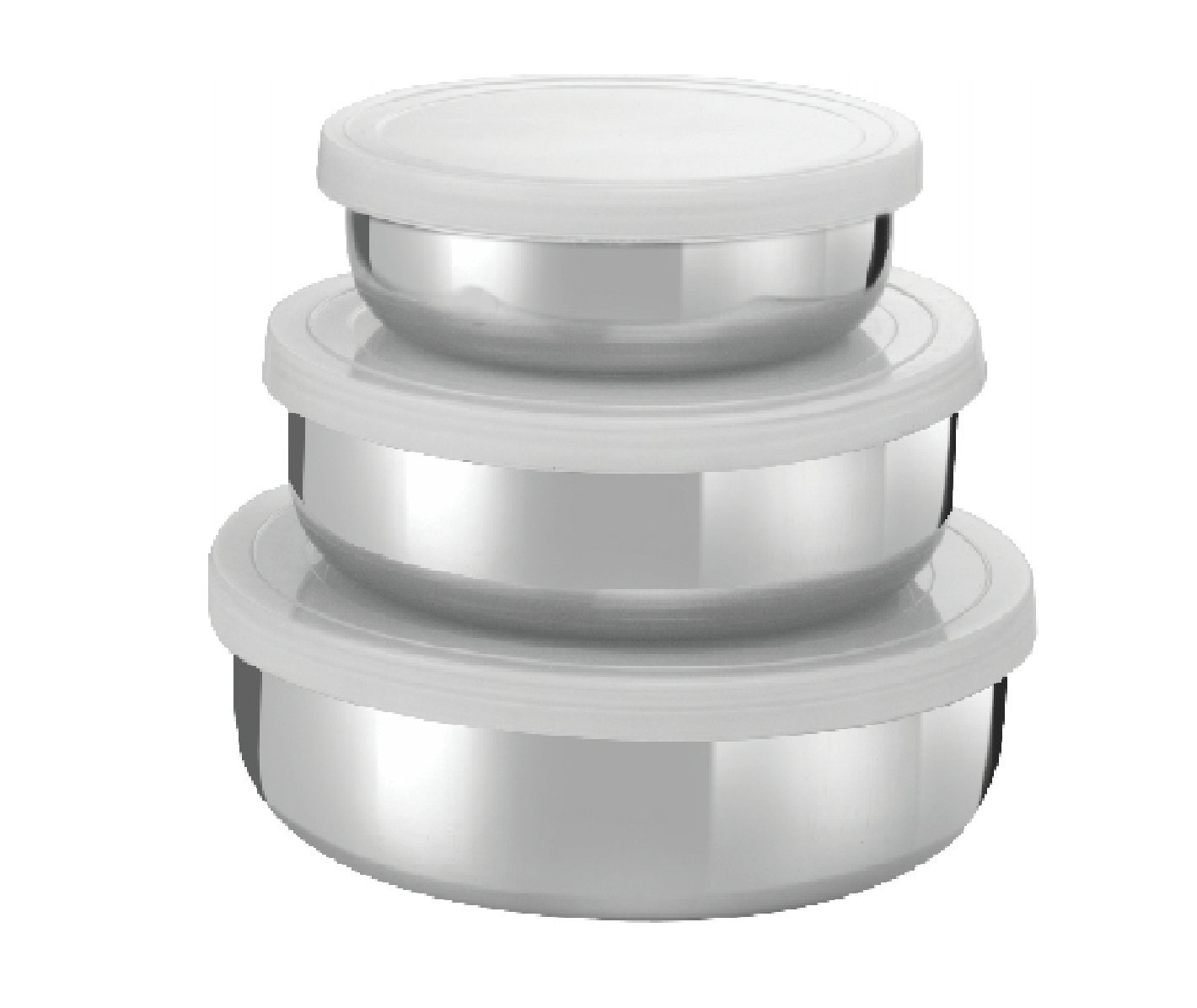In order to cater to the varied demands of patrons, we are busy in manufacturing, supplying and exporting Steel Mixing Bowl Plastic Lid. Provided bowls are manufactured by making use of the high grade stainless steel, owing to which these are in-line with the best traditional quality standards of the industry. Three Stainless steel container Plastic Lid SS bowl 18,16,14,12,10 10 - 100 mm diameter weight-55 gm 12 - 120 mm diameter weight-75 gm 14 - 140 mm diameter weight-105 gm three pc set Printed Corrupted box.