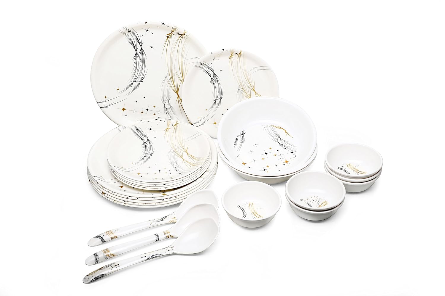 CONTENTS FULL PLATE-6(26.0cm), HALF PLATE-6(20.0cm), VEG BOWL-6(10.5cm), OPEN DONGA-3(20.0cm), SERVING SPOONS-3(24.0cm)