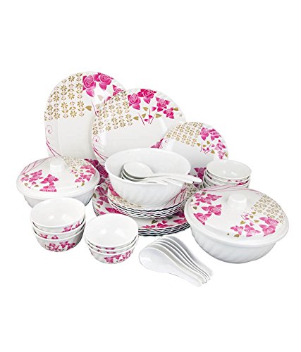 "40 Pcs Melamine Dinner Set Material- Melamine Content-40 Piece Detail of Content: 6 Piece Full Plate = (LXW) 27.5x27.5 cm 6 Piece Qtr Plate = (LXW) 19x19 cm 6 veg. Bowls = (LXW) 10.5x10.5 cm, 200ml (each) 6 Soup Bowls = (LXW) 11.5x11.5 cm, 300ml (each) 02 PieceDonga = (LXW) 20x20 cm, 1300ml (each) 02 Donga Lid = (LXW) 21x21 cm 01 open donga = (LXW) 20x20 cm, 1300ml 06 Soup Spoon = (L) 13.5 cm 01 Piece Rice Platter = (LXW) 25.5x32 cm 04 Serving Spoon = (L) 24.5 cm Key Feature- Easy to Clean Food Grade Melamine Dinner set is designed with superior strength and supreme style so you can enjoy it every day for every occasion. This beautiful desert set is made of lightweight melamine which is great for your picnics, outings or even for eating everyday meals at home! The dual color will brighten up any dining room and is to draw compliments from your dinner guests. And to make clean-up easier, you can just throw the dinner plate in the dishwasher "