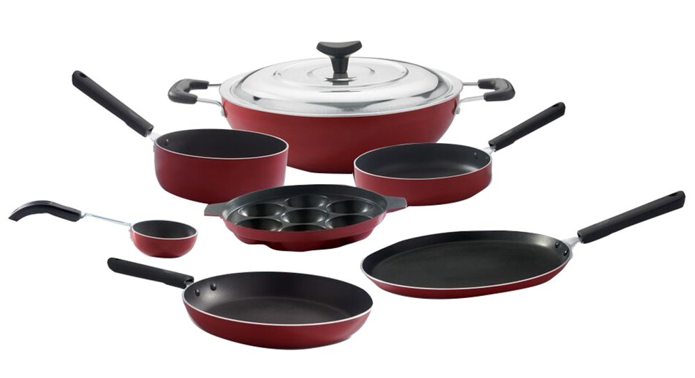 - Package Contents: 1 Crepe Pan, 1 Tapper Fry Pan , 1 Wok SS Lid, 1 Spice Pan, 1 Multi Pan, 1 Sauce Pan and 1 Appam.