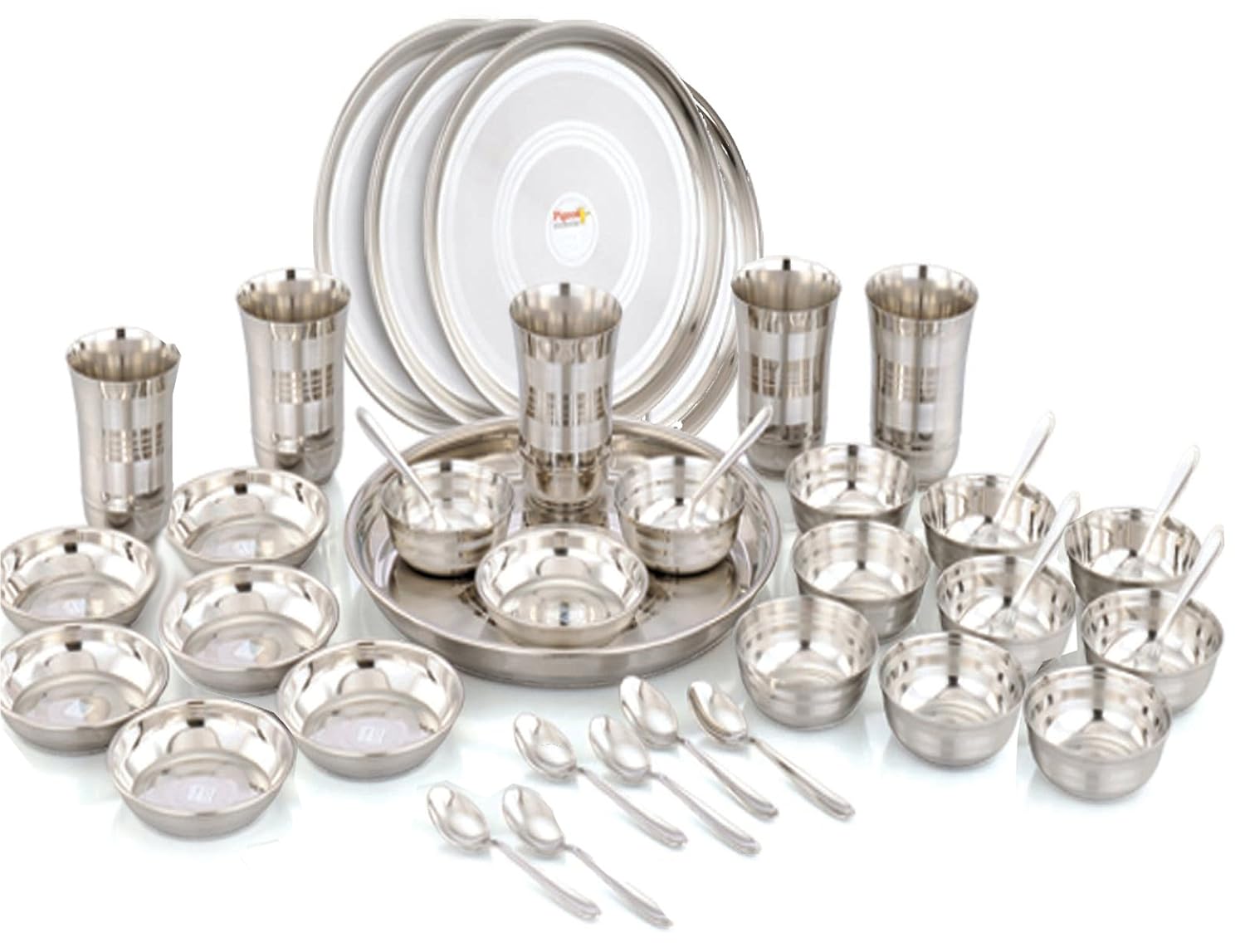 - Package Contents: 6-Pieces Thali (30cm, 250gms each), 12-Pieces Katori (13cm, 40 gms each), 6-Pieces Glass (18cm, 65gms each), 6-Pieces Halwa Plate (14cm, 50 gms each) and 12-Pieces Tea Spoon (15 gms each)