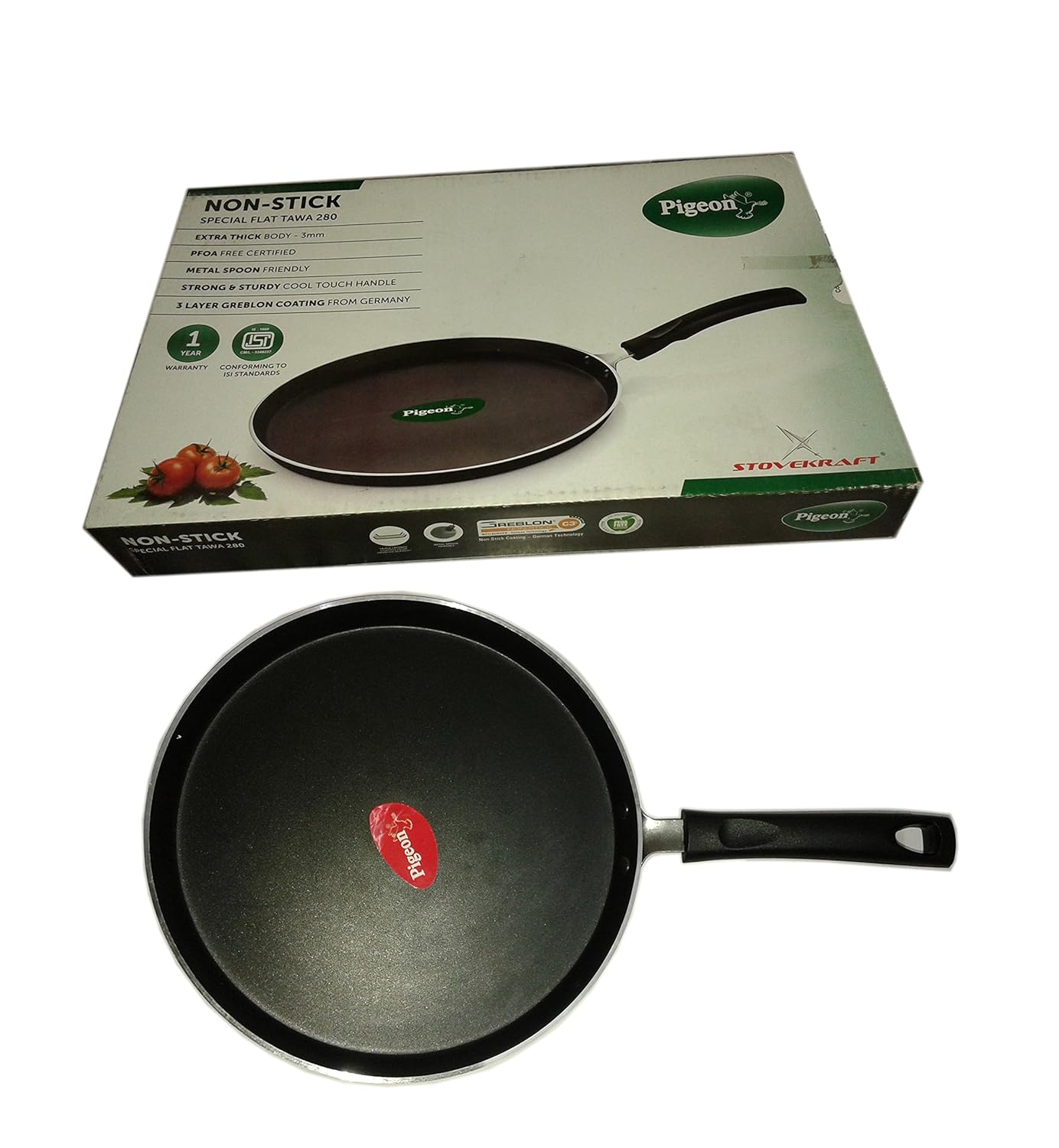 The hard-wearing material of this griddle Pigeon flat tawa has been encrusted with a thick German Stonehenge coating that enables it to endure high temperatures. This non-stick coating is also scratch-resistant, thus you can use metal spoons and ladles. Furthermore, its 4-mm thick body with thermocare base ensures your food items do not get burnt when you are using high flame. With this special fry pan, you are able to prepare items that are not only scrumptious but also nutritious as very little oil is needed during cooking.